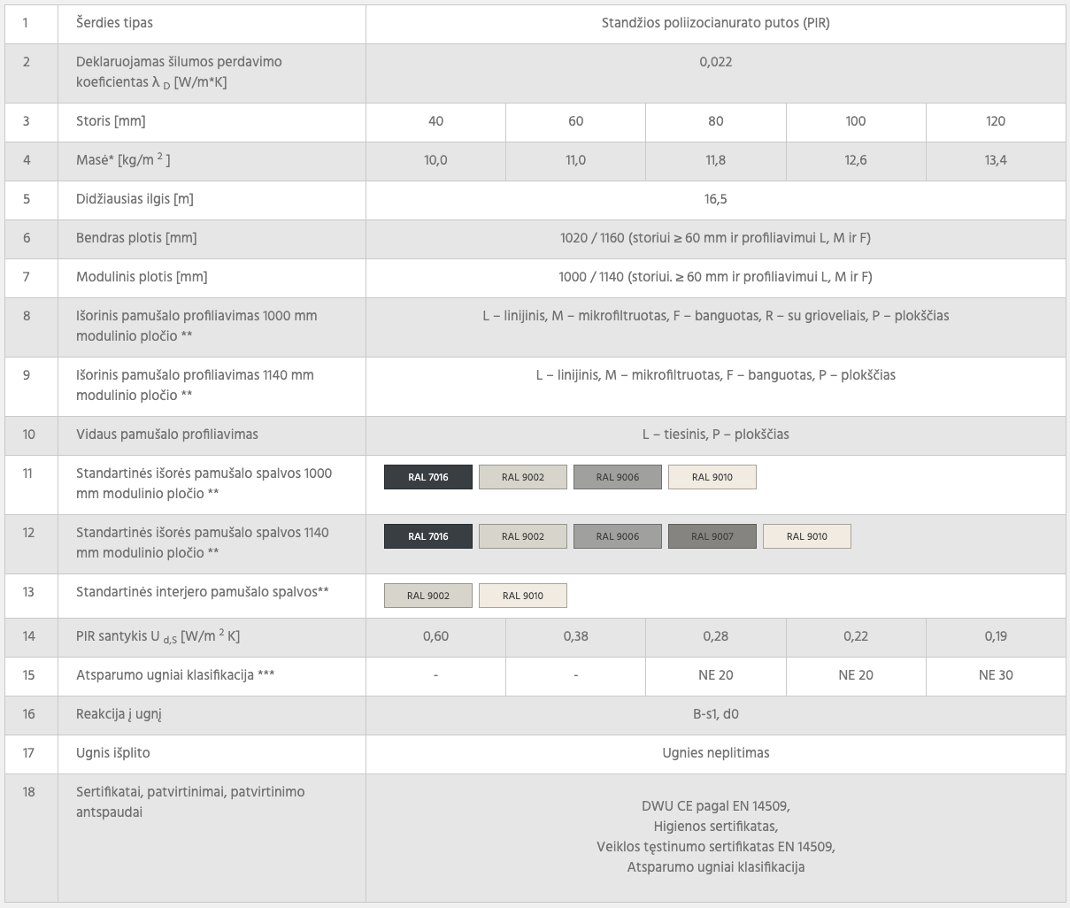 - Šerdis pagamintas iš standžių PIR putų, pasižyminčių labai geromis šilumos izoliacijos ir ugnies savybėmis